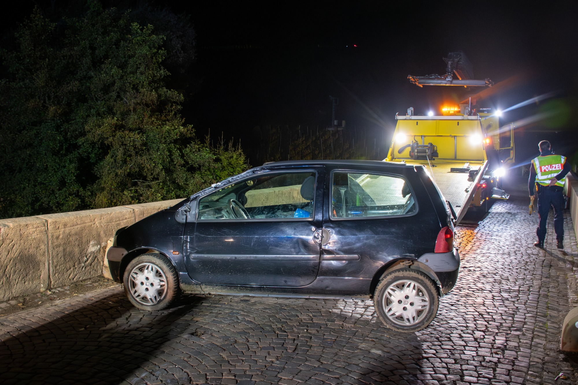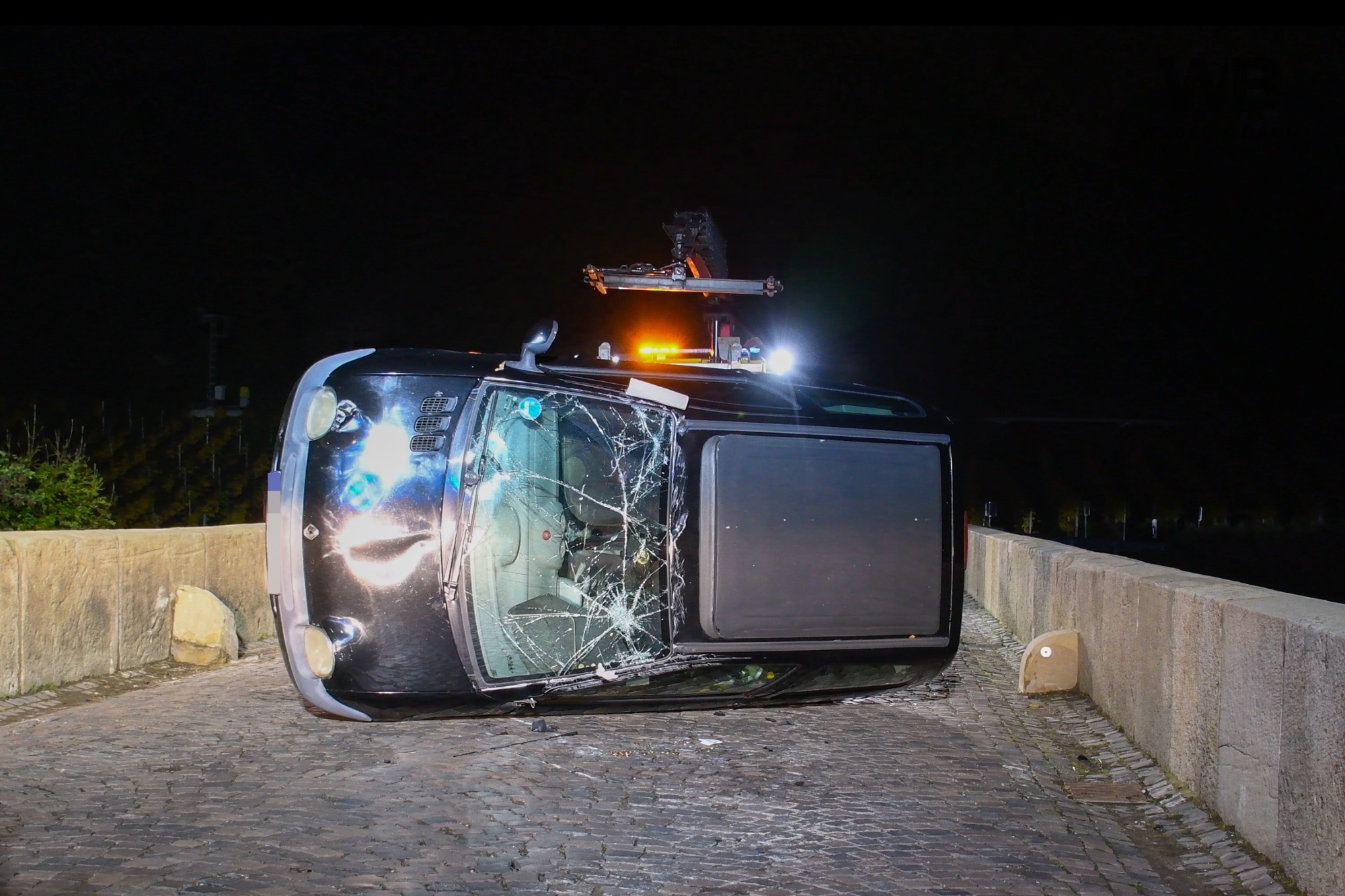 Am 03.11.2025 kam es auf der Landstraße 235 zwischen Oberhausen an der Nahe und Niederhausen an der Nahe zu einem spektakulären Verkehrsunfall. Ein aus Niederhausen kommender Pkw, der in Richtung Oberhausen unterwegs war, verunglückte auf einer Brücke. Nach bisherigen Erkenntnissen überfuhr das Fahrzeug einen Pfosten, überschlug sich in der Folge und kam schließlich auf dem Dach zum Liegen.