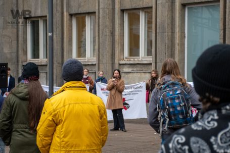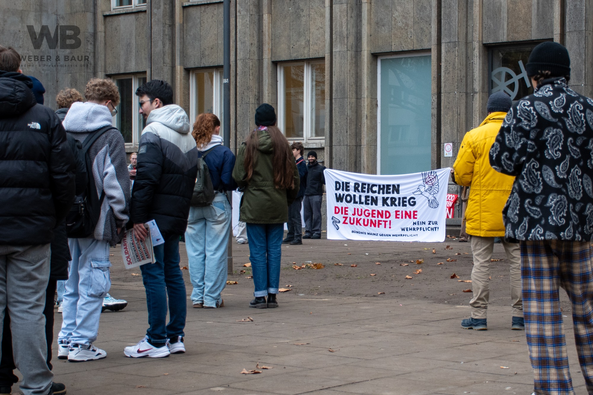 Bereits am Nachmittag versammelten sich Demonstrierende auf der Mainzer Kaiserstraße. Unter den Teilnehmenden befanden sich viele Schülerinnen, Eltern, Studierende und junge Erwachsene sowie Vertreterinnen verschiedener Friedens- und Bürgerrechtsinitiativen. Die Kundgebung verlief friedlich, aber entschlossen: In Redebeiträgen, Sprechchören und Transparenten machten die Teilnehmenden klar, dass sie staatlich verordnete Zwangsdienste und die zunehmende Militarisierung der Gesellschaft strikt ablehnen.