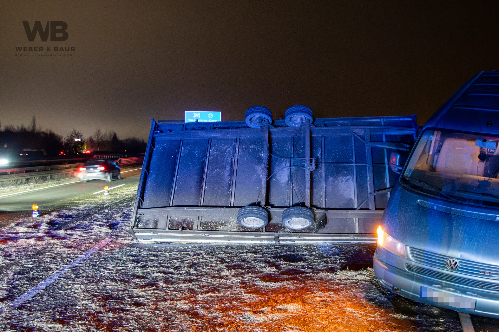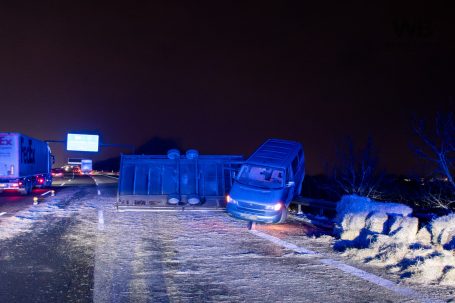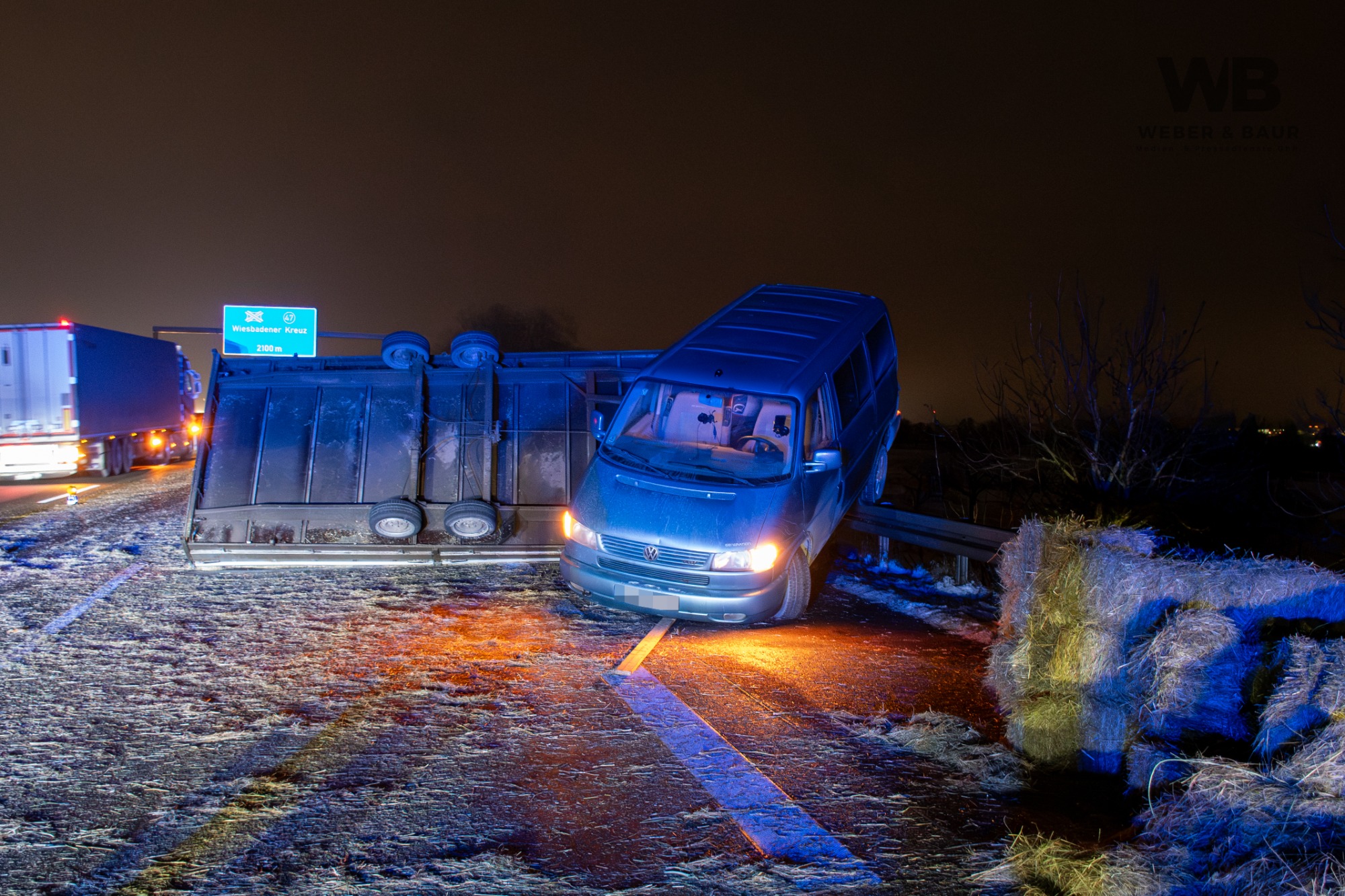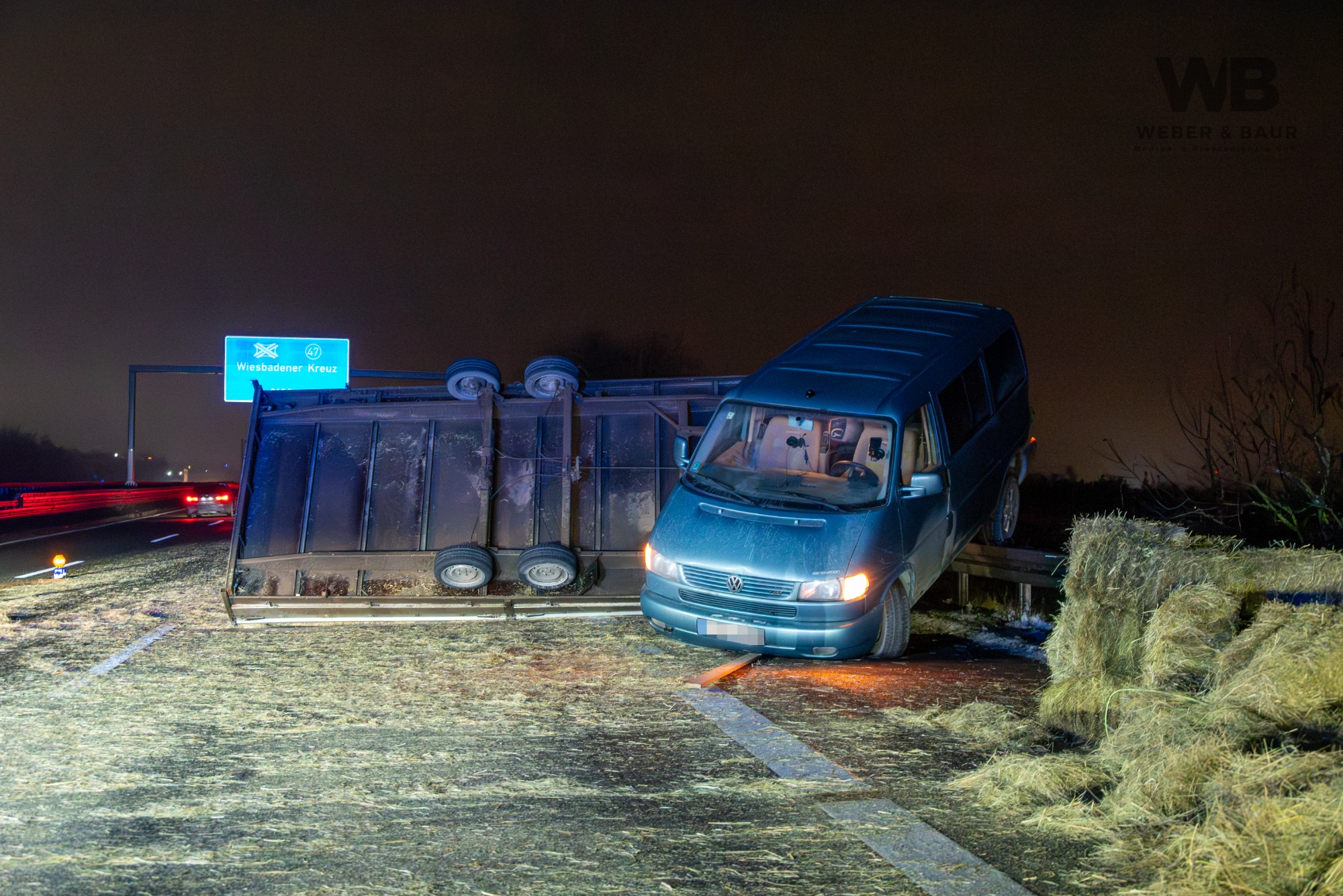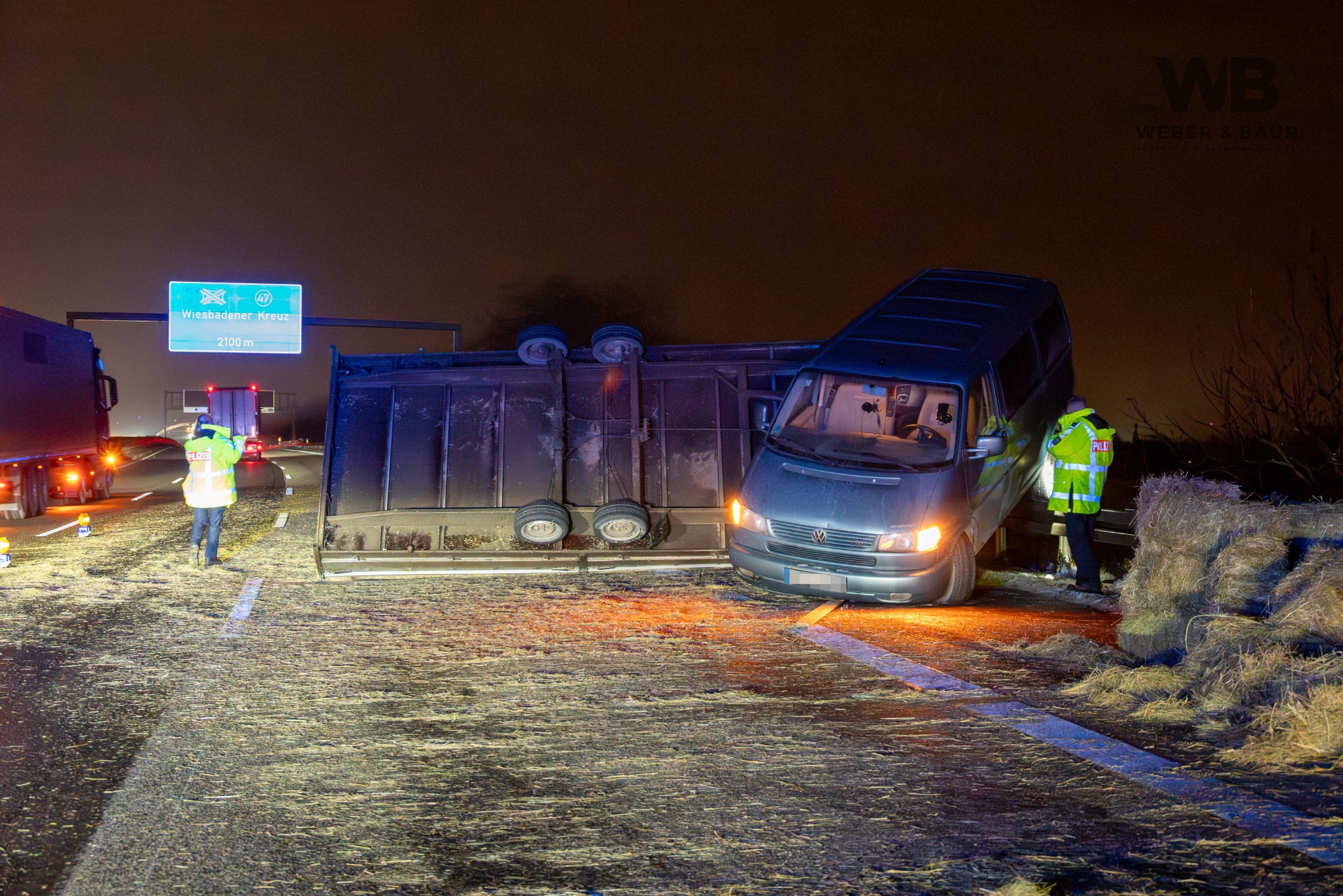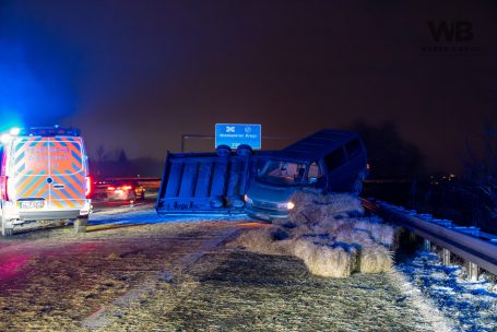 Am Dienstagabend, dem 6. Januar 2026, kam es gegen 20:55 Uhr auf der Autobahn A3 bei Wiesbaden zu einer Vollsperrung infolge eines Verkehrsunfalls. Ein 41-jähriger deutscher Fahrer befuhr mit seinem Pkw und einem mit Strohballen beladenen Anhänger den rechten von drei Fahrstreifen in Fahrtrichtung Süden. Als sich von hinten ein Polizeifahrzeug mit eingeschaltetem Blaulicht näherte, wollte der Fahrer Platz machen und lenkte auf den Standstreifen. Dabei lenkte er jedoch zu stark ein, sodass sich der Anhänger aufschaukelte und schließlich auf die Seite kippte. Die Ladung löste sich und verteilte sich in Form mehrerer Strohballen über die Fahrbahn.