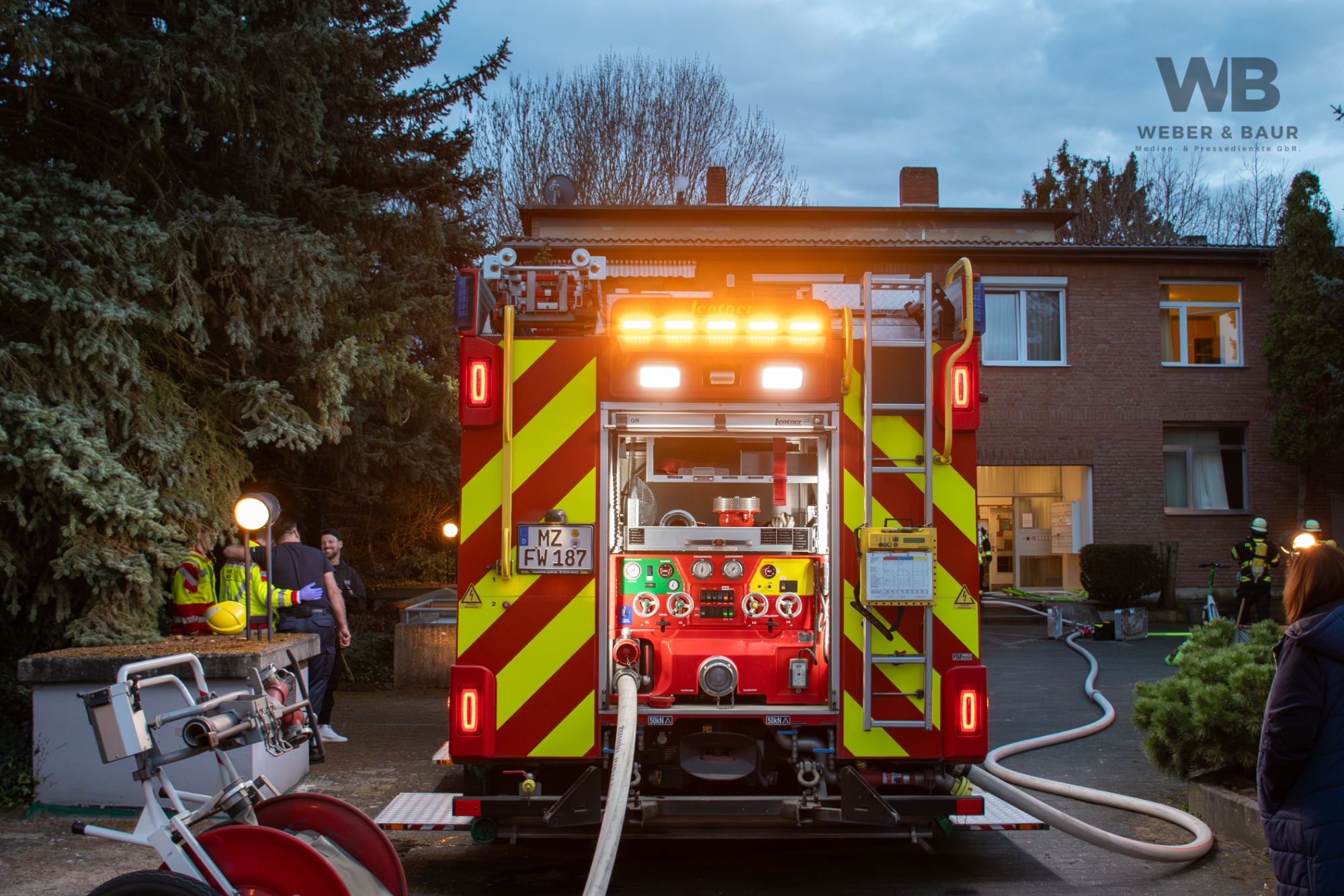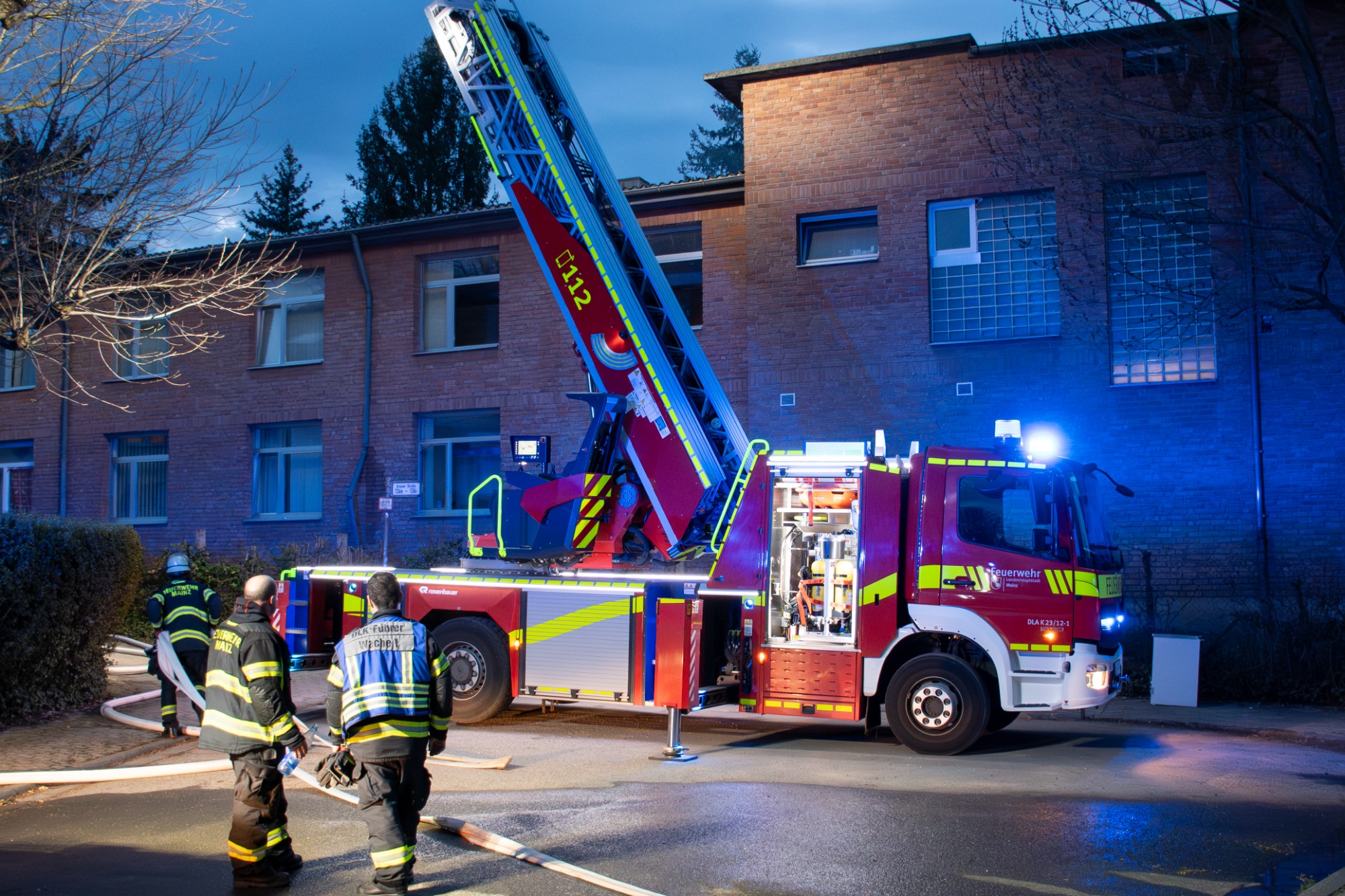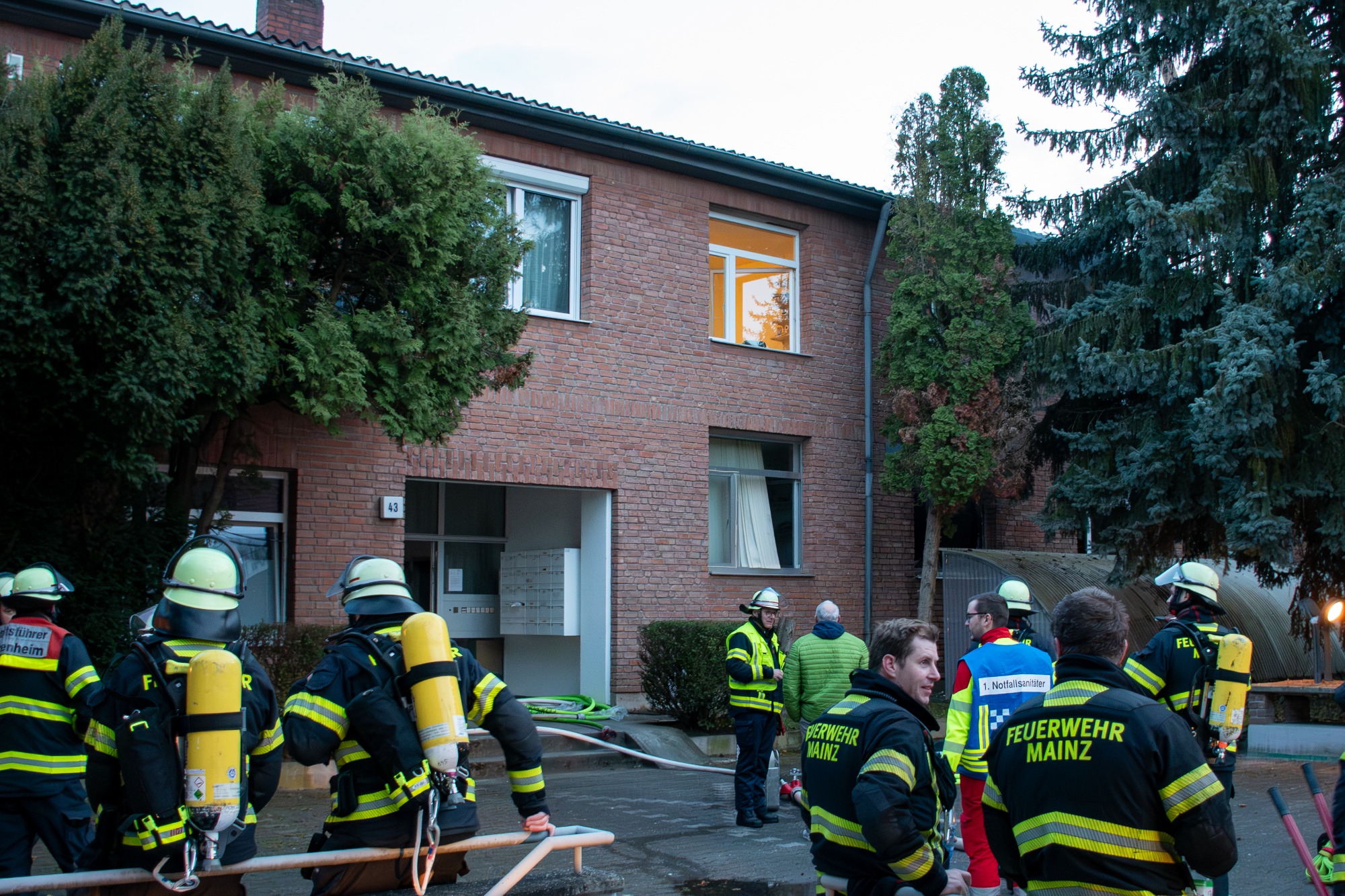 Daraufhin wurden umgehend Kräfte der Berufsfeuerwehr Mainz von beiden Wachen sowie Einheiten des Rettungsdienstes alarmiert. Beim Eintreffen der ersten Einsatzkräfte stand eine Wohnung im Erdgeschoss bereits in Vollbrand. Zudem drang aus mehreren Bereichen des Gebäudes dichter, schwarzer Rauch. Einige Bewohnerinnen und Bewohner befanden sich bereits im Freien, allerdings war zunächst unklar, ob sich noch weitere Personen im Gebäude aufhielten.