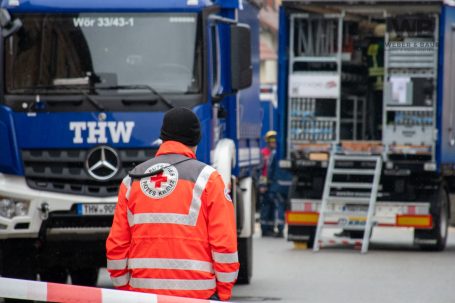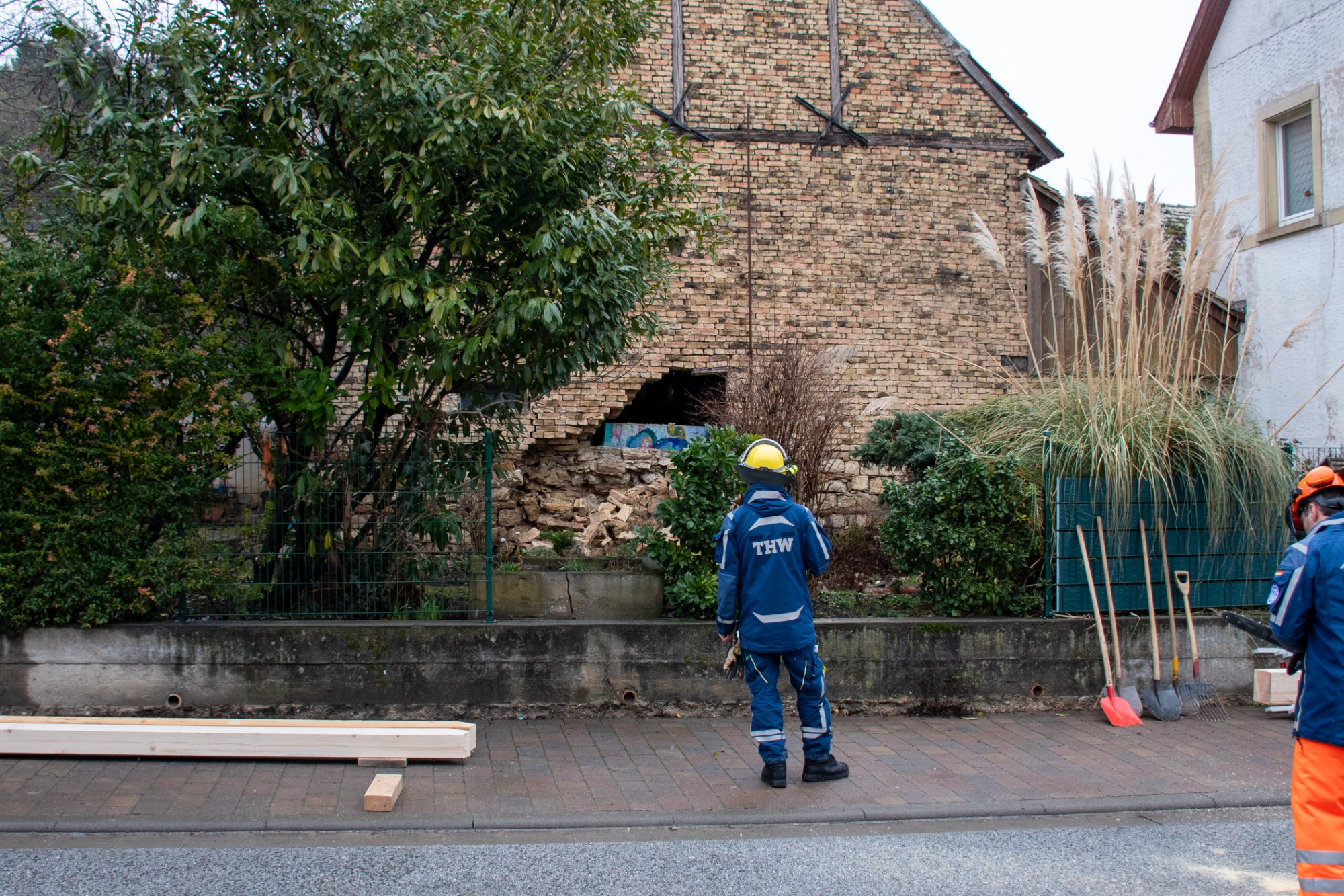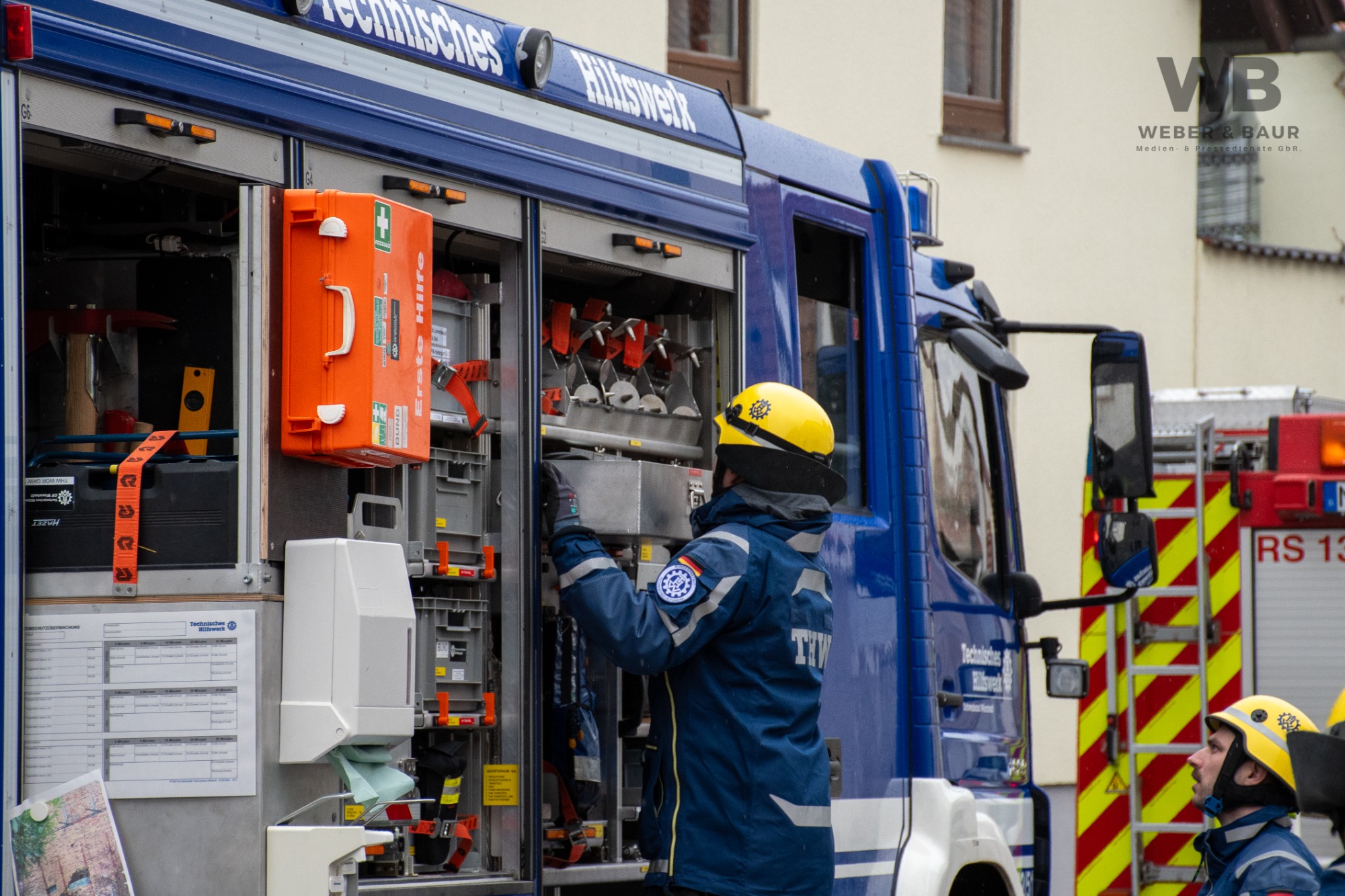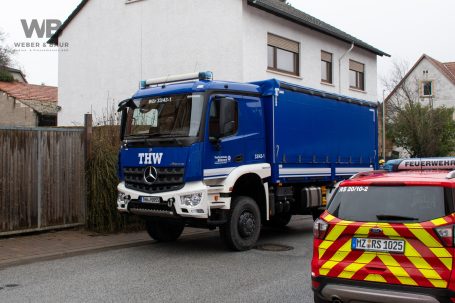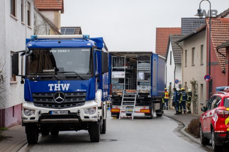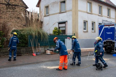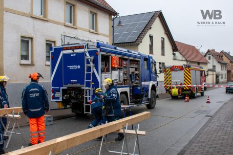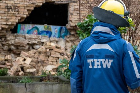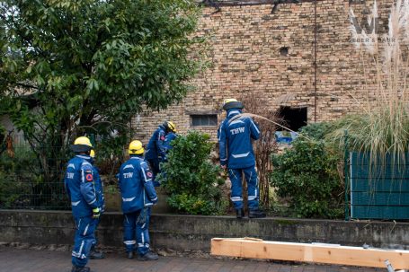 Zur Beurteilung der Gebäudestatik forderte die Feuerwehr einen Baufachberater des THW nach. Feuerwehr und THW sichern das betroffene Gebäude derzeit gemeinsam ab, um weitere Gefahren auszuschließen.